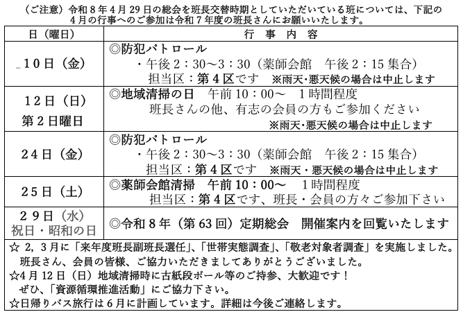 本日10時より予定していました4月の地域清掃活動は、雨天予報のため中止いたします。次回よろしくお願いいたします。