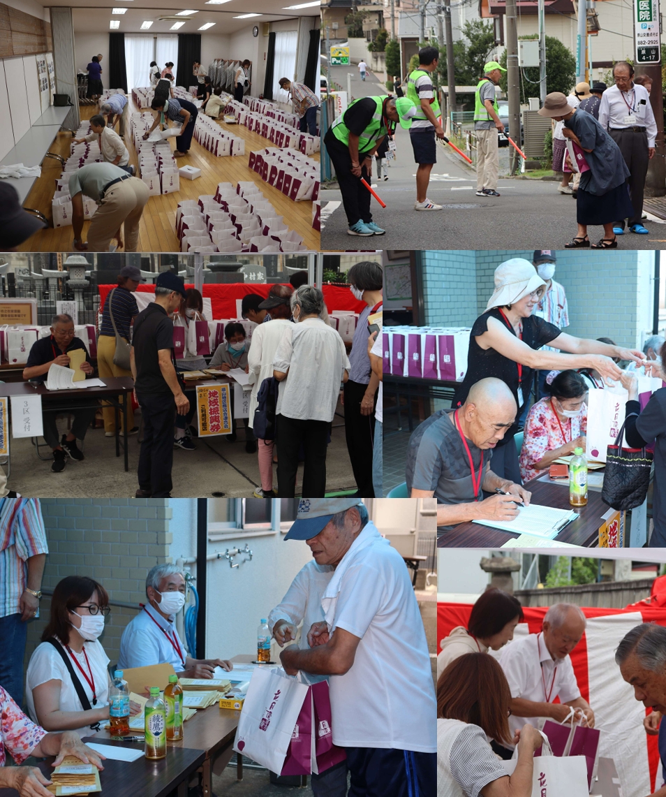 9月15日敬老の日に、敬老お祝い会を実施しました。当日はお祝い記念品として、地区社協より地域振興券、自治会よりお赤飯や即席みそ汁・どら焼き等を配布しました。